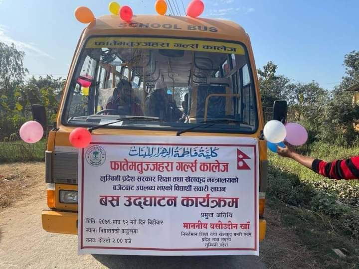 سابق پردیس وزیر تعلیم اور کھیل کود جناب وصی الدین خان کے تعاون سے کلیہ فاطمۃ الزھراء للبنات بھنگہیا کو ایک بس ہدیہ کیاگیا،جس کا افتتاح سابق وزیر تعلیم اور کھیل کود وصی الدین خان نے ریبن کاٹ کرکے کیا اور کلیہ کا پورا عملہ اس میں سوار ہوکر لطف اندوز ہوئے، واضح رہے کہ کلیہ کی بچیوں کو یہ سہولت فراہم کرکے بہت بڑا کام کیا ہے۔