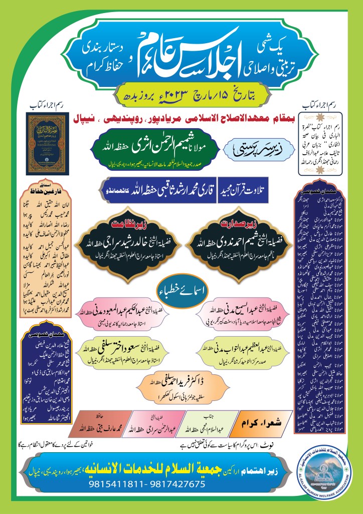 مولانا اشفاق احمد سنابلی نے نیپال اردو ٹائمز کو بتایا کہ یہ پروگرام اس لحاظ سے اہم ہے کہ جمعیت کے زیراشراف معہد الاصلاح سے 12 حفاظ کی دستار بندی ہوگی اور خطیب الھند ونیپال علامہ عبدالرؤف رحمانی رحمہ اللہ کی تالیف کردہ کتاب نصرۃ الباری فی بیان صحۃ البخاری کا عربی ایڈیشن کا رسم اجراء بھی ہے، کتاب کی طباعت عربی طباعت ومجلد جیسی ہے۔ واضح رہے کہ یہ پروگرام شیخ شمیم احمد ندوی کی زیر صدارت اور شیخ خالد رشید سراجی کی نظامت میں ہورہاہے۔پروگرام کو کامیاب بنانے کی ہر ممکن کوشش کی جارہی ہے۔