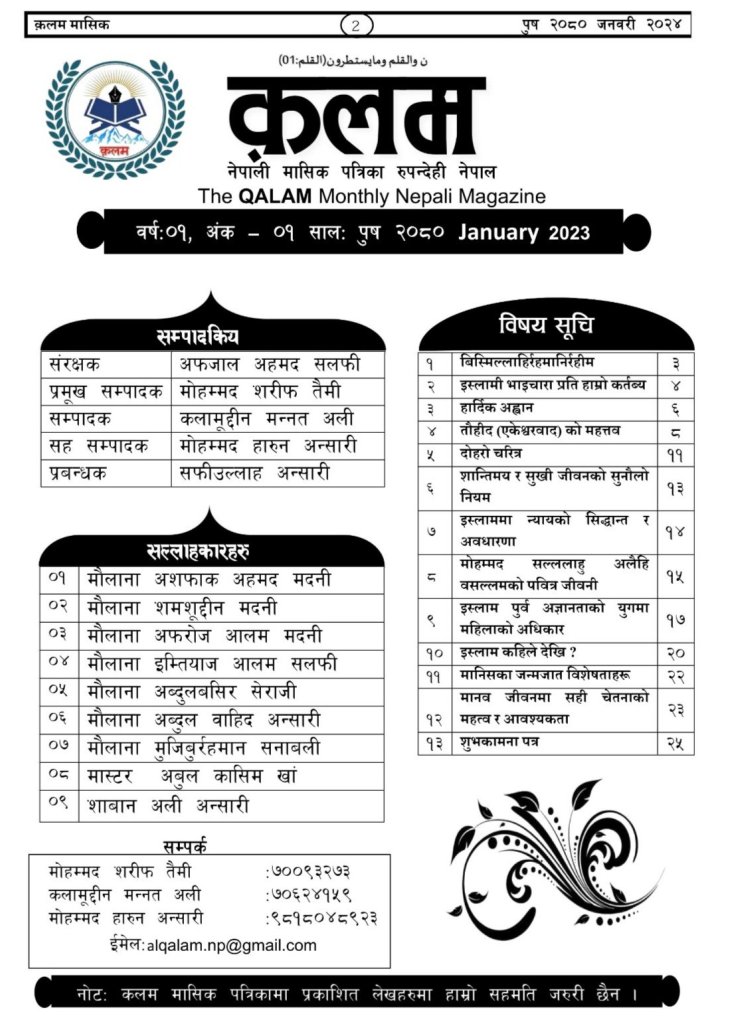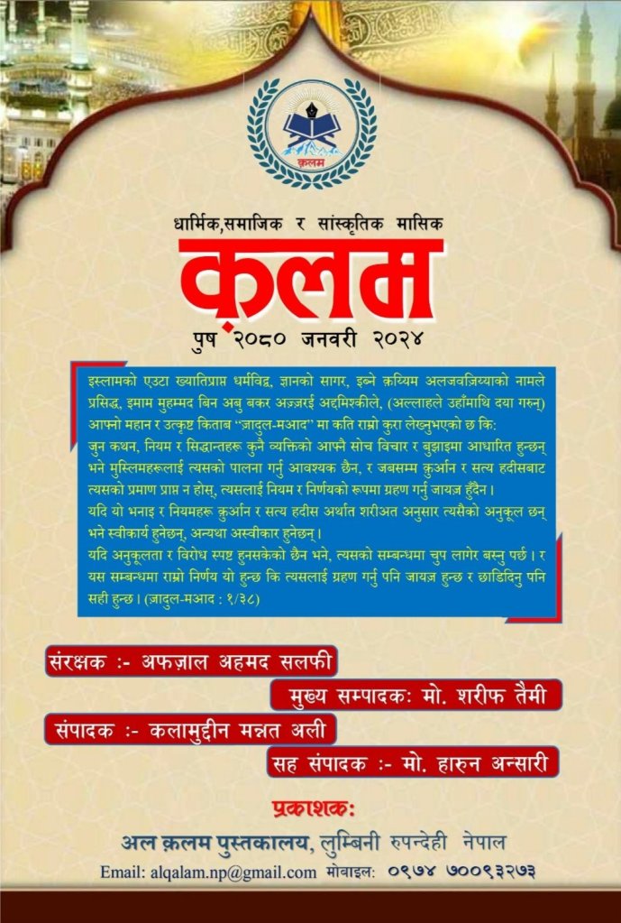 بتاریخ 09/دسمبر 2023 بروز سنیچر بعد نمازِ عشاء دوحہ کے کومیلا ہوٹل میں مجلہ ماہنامہ قلم بزبان نیپالی کی تقریب رسم اجراء کا انعقاد عمل میں آیا، جس کی صدارت ملک نیپال سے قطر تشریف لائے ہوئے بزرگ عالم دین ڈاکٹر سعید احمد اثری-حفظہ اللہ – مہتمم جامعہ خدیجۃ الکبری للبنات جھنڈا نگر نیپال نے فرمائی جبکہ نظامت کے فرائض سرپرست مجلہ مولانا افضال احمد شمیم سلفی حفظہ اللہ نے انجام دیئے۔