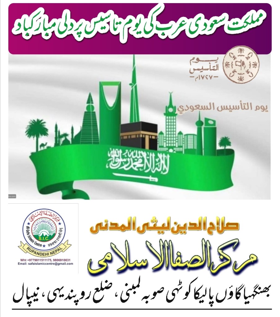 اسی یوم تاسیس کی مناسبت سے مرکز الصفا الإسلامى روپندیہی نیپال کے تمام ذمہ داران خادم الحرمین الشریفین شاہ سلمان بن عبدالعزیز آل سعود اور ولی عہد شہزادہ محمد بن سلمان آل سعود حفظہم اللہ اور مملکت کے جملہ امراء ‘ملوک’ اعیان مملکت اور علماء و فقہاء اور سعودی عوام سب کو دلی مبارکباد پیش کرتے ہیں ۔ فجزاھم اللہ تعالٰی عنا احسن الجزاء