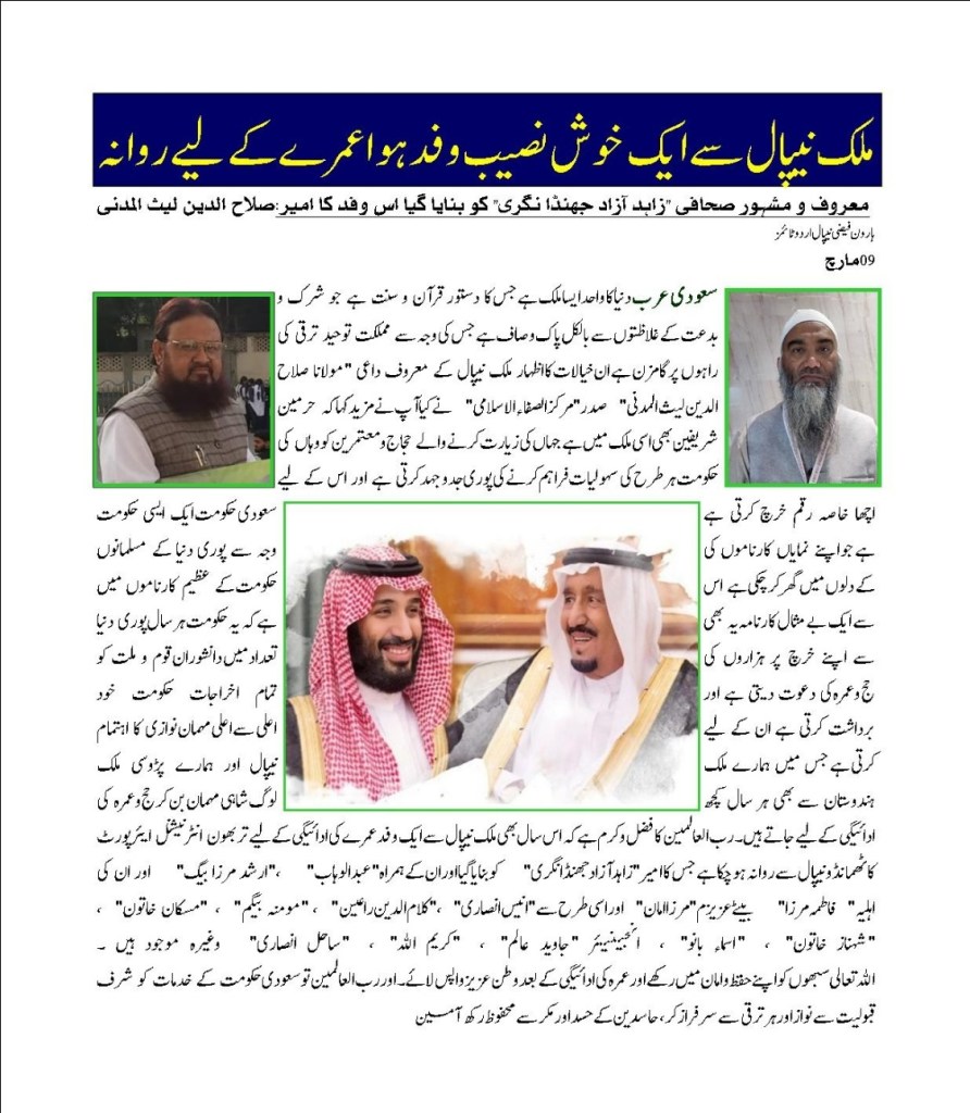 سعودی عرب دنیا کا واحد ایسا ملک ہے جس کا دستور قرآن و سنت ہے جو شرک و بدعت کے غلاظتوں سے بالکل پاک و صاف ہے جس کی وجہ سے مملکت توحید ترقی کی راہوں پر گامزن ہے ان خیالات کا اظہار ملک نیپال کے معروف داعی “مولانا صلاح الدین لیث المدنی” صدر “مرکز الصفاء الاسلامی” نے کیا آپ نے مزید کہا کہ حرمین شریفین بھی اسی ملک میں ہے جہاں کی زیارت کرنے والے حجاج و معتمرین کو وہاں کی حکومت ہر طرح کی سہولیات فراہم کرنے کی پوری جدوجہد کرتی ہے اور اس کے لیے اچھا خاصہ رقم خرچ کرتی ہے سعودی حکومت ایک ایسی حکومت ہے جو اپنے نمایاں کارناموں کی وجہ سے پوری دنیا کے مسلمانوں کے دلوں میں گھر کر چکی ہے اس حکومت کے عظیم کارناموں میں سے ایک بے مثال کارنامہ یہ بھی ہے کہ یہ حکومت ہر سال پوری دنیا سے اپنے خرچ پر ہزاروں کی تعداد میں دانشوران قوم و ملت کو حج و عمرہ کی دعوت دیتی ہے اور تمام اخراجات حکومت خود برداشت کرتی ہے ان کے لیے اعلی سے اعلی مہمان نوازی کا اہتمام کرتی ہے جس میں ہمارے ملک نیپال اور ہمارے پڑوسی ملک ہندوستان سے بھی ہر سال کچھ لوگ شاہی مہمان بن کر حج و عمرہ کی ادائیگی کے لیے جاتے ہیں ۔ رب العالمین کا فضل و کرم ہے کہ اس سال بھی ملک نیپال سے ایک وفد عمرے کی ادائیگی کے لیے تربھون انٹرنیشنل ایئرپورٹ کاٹھمانڈو نیپال سے روانہ ہو چکا ہے جس کا امیر “زاہد آزاد جھنڈا نگری” کو بنایا گیا اور ان کے ہمراہ “عبدالوہاب” ، “ارشد مرزا بیگ” اور ان کی اہلیہ ” فاطمہ مرزا” بیٹے عزیزم “مرزا امان” اور اسی طرح سے “انیس انصاری” ، “کلام الدین راعین” ، “مومنہ بیگم” ، “مسکان خاتون” ، “شہناز خاتون” ، “اسماء بانو” ، انجینیئر “جاوید عالم” ، “کریم اللہ” ، “ساحل انصاری” وغیرہ موجود ہیں