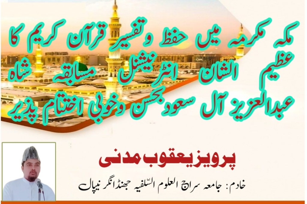 الحمد للہ کتاب و سنت پر قائم حکومت سعودی عرب کے اندر رواں مہینے کے اندر سابقہ روایات کے تحت خادم الحرمین الشریفین شاہ سلمان بن عبد العزیز آل سعود حفظہ اللہ کی زیر سرپرستی اور سعودی عرب کی وزارت برائے دینی امور و دعوت و ارشاد کی جانب سے مھبط وحی مکہ مکرمہ میں اسلامی ممالک کے وزرائے اوقاف و اسلامی امور کی نوویں کانفرنس بموضوع: وسطیت کے اصولوں کو فروغ دینے اور اعتدال کے اقدار کو مستحکم کرنے میں اسلامی امور و اوقاف کی وزارتوں کا کردار۔ کے شاندار اختتام کے بعد شہر مکہ میں ایک عالمی مسابقہ حفظ قرآن وتفسیر کا آغاز و اختتام ہوا۔ فللہ الحمد۔