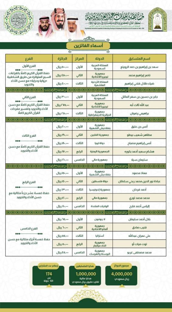 اسی سلسلے کی ایک کڑی کہ سابقہ روایت کو برقرار رکھتے ہوئے حکمران سعودی عرب نے امسال بھی مکہ مکرمہ میں عظیم الشان مسابقہ حفظ و تفسیر قرآن مجید کا انعقاد کیا۔ جس میں 123/ ملکوں کے 174/ حفاظ کرام کو شاہی خرچ پر مدعو کیا گیا ، تمام مشارکین کو انعامات و اعزازات اور اسناد سے نوازا گیا، اور کئی لاکھ ریال خرچ کیے گئے ۔ یہ مملکت سعودی عرب کی کتاب و سنت، اور مسلمانان عالم سے محبت کی عظیم اور بین دلیل ہے۔