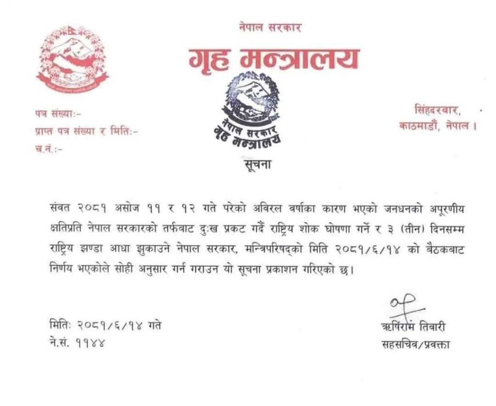 11 اور 12 اسوج 2081 کو ہونے والی موسلا دھار بارشوں کی وجہ سے لوگوں کے جان و مال کی ناقابل تلافی نقصان کی وجہ سے نیپال کی حکومت نے قومی سوگ کا اعلان کرنے اور 3 (تین) دن تک قومی پرچم سرنگوں رکھنے کا فیصلہ کیا ہے۔ آپ کو تعمیل کرنے کے لیے نوٹس شائع کیا گیا ہے۔