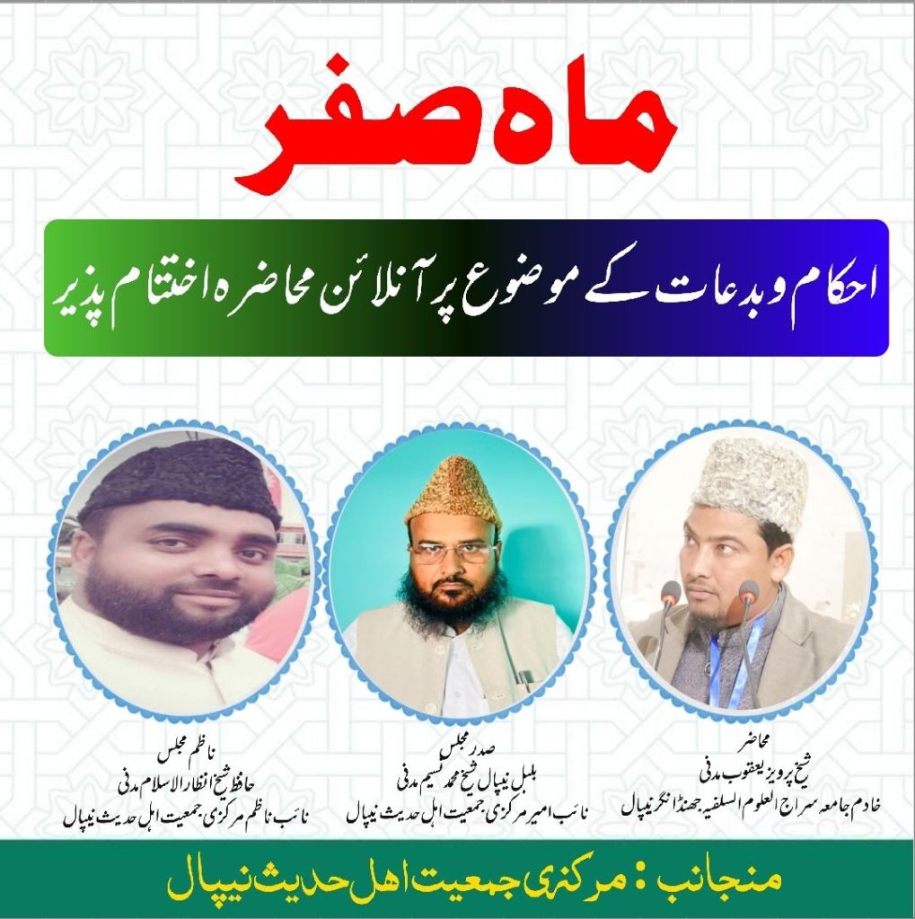 ۳۱/جولائی بروز جمعرات بعد نماز عشاء مرکزی جمعیت اہل حدیث نیپال کے زیر اہتمام “ماہِ صفر: احکام و بدعات” کے موضوع پر ایک اہم اور بصیرت افروز آن لائن محاضرہ کا انعقاد کیا گیا، جس میں علماء کرام و عوام کی ایک بڑی تعداد نے شرکت کی۔